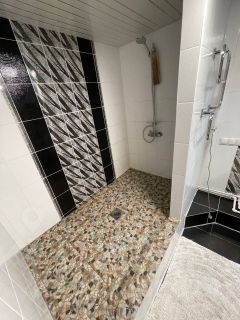 1этаж-188м.кв. -две спальни, просторная кухня гостиная, санузел. Потолок-имитация бруса, стены- блокхаус класс А. везде теплый водяной пол, батареи в спальнях.