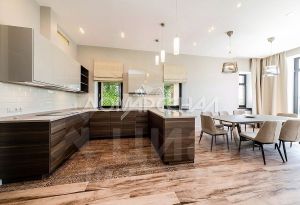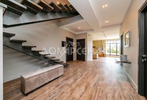 В отделке использованы материалы от ведущих европейских производителей, комбинированная отделка стен — покраска, вставки из высококачественных обоев, полы: итальянская плитка и инженерная доска. Дубовая лестница. Двери - натуральный шпон. Потолки - гипсокартон. Вся сантехника от известных европейских брендов: Jacob Delafon, Laufen, Hansgrohe, Geberit, DornBracht, Vitra.