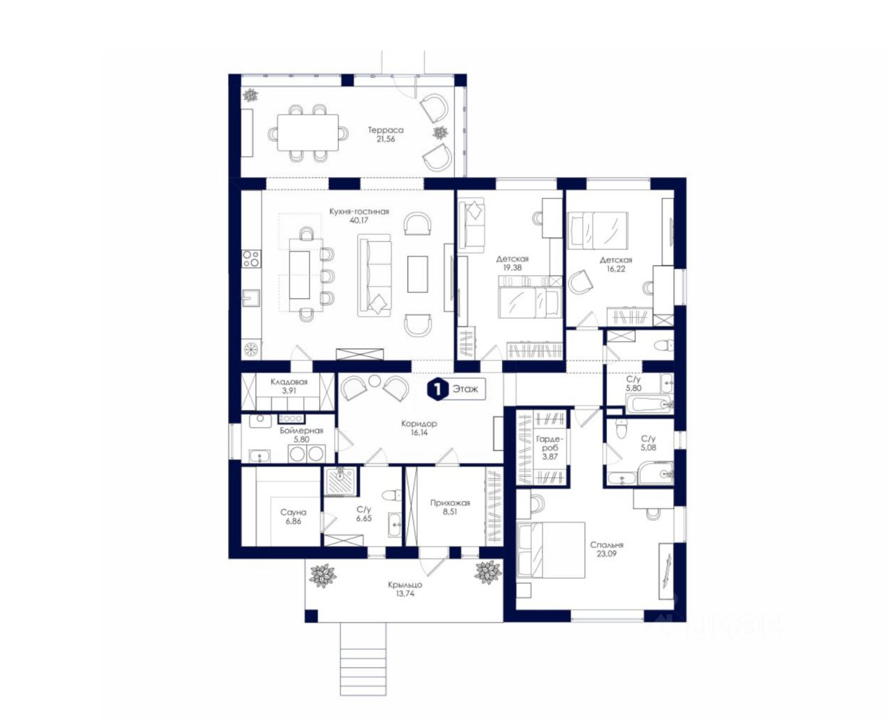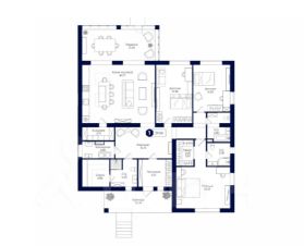 Дом удачно разделён на общую зону, которая состоит из прихожей, кухни с кладовой, гостиной и банного комплекса, и на приватную территорию только для владельцев дома и их детей. Предусмотрен камин.