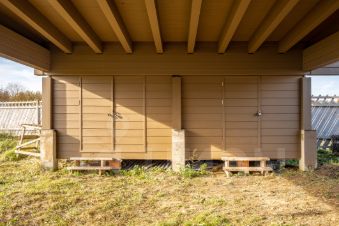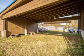 Навес на 2 автомобиля упирается в двухсекционный хозяйственный блок (большая секция рассчитана на лодку).