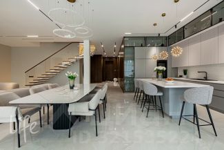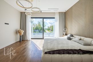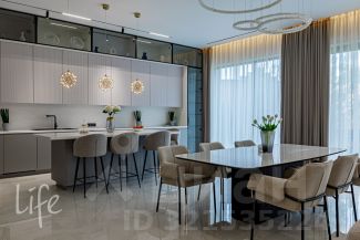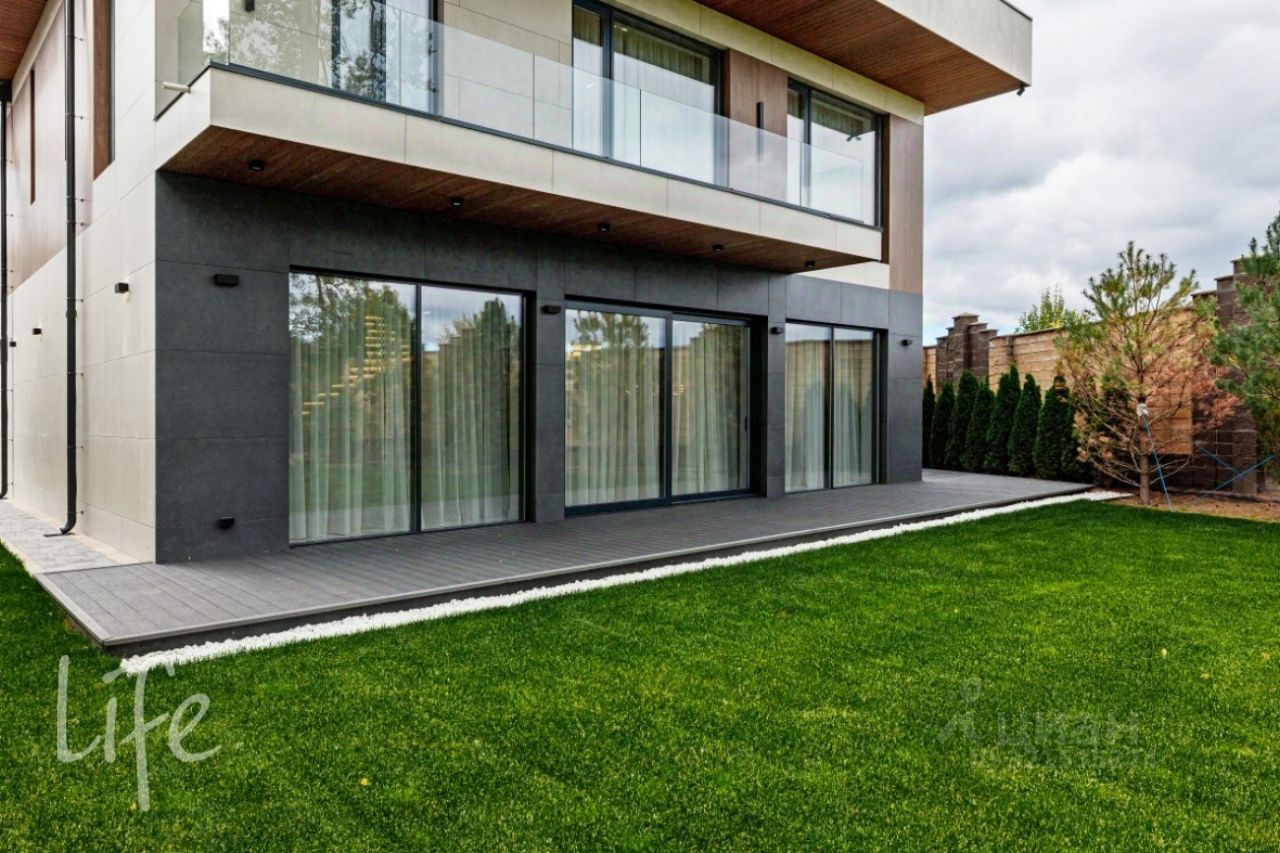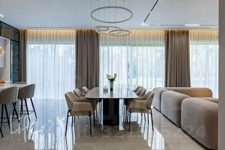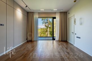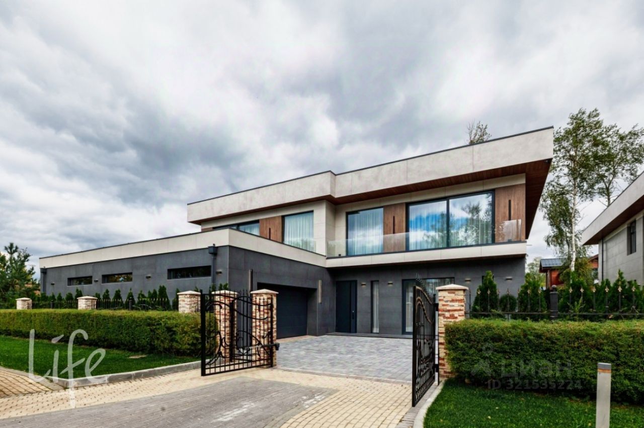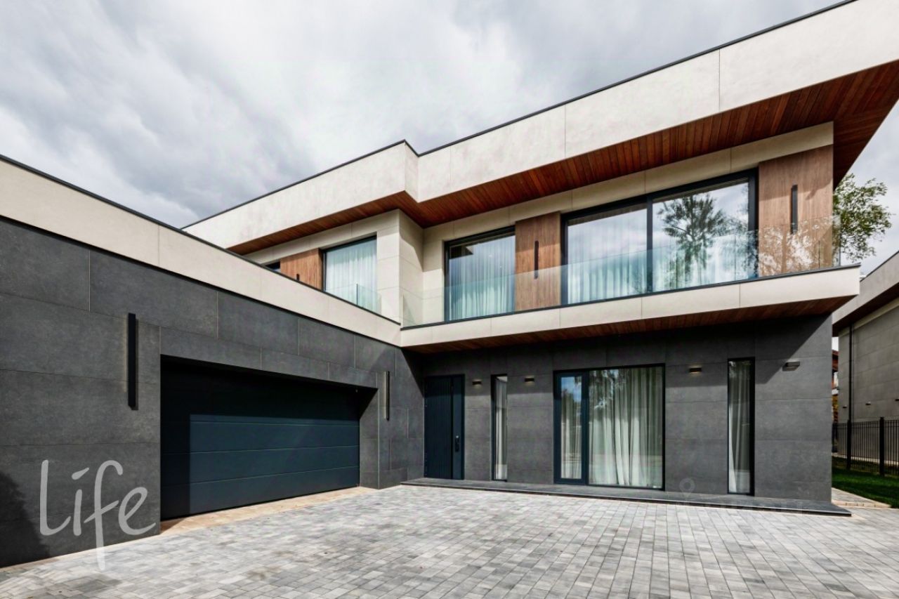 Панорамное остекление, плоская кровля. В отделке и строительстве использовались материалы премиального качества.