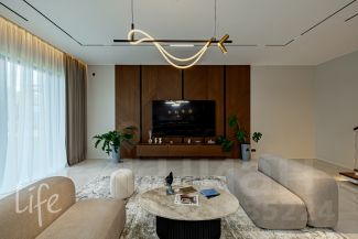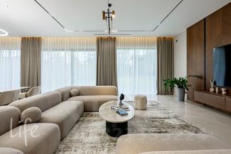 Современный интерьер, выполненный в светлых пастельных тонах, с акцентом на натуральное дерево, передовые световые решения.