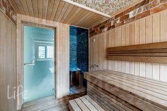 1 этаж: прихожая, гардеробная, гостиная-кухня-столовая, спальня, с/у, квартира для персонала, зона СПА с душевой, сауной, с/у, постирочная, котельная, гараж на два автомобиля.