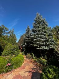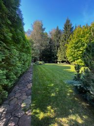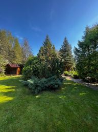 - много деревьев: есть плодовые, хвойные и ухоженный газон;