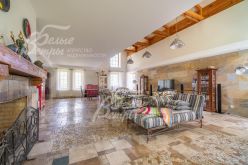 Описание внутренней отделки: отделка выполнена по авторскому проекту в итальянском стиле (отделочные материалы привезены из Италии). В оформлении интерьера массивные балки под потолком, камень травертин. На стенах декоративная штукатурка, декоративные деревянные элементы, вставки из травертина (в гостиной и на лестнице), в санузлах плитка. На полу всего первого этажа и в санузлах мозаика из травертина с подогревом, в остальных помещениях паркетная доска из массива дуба. На 1-м этаже потолки из гипсокартона, многоуровневые с разноплановой подсветкой с декоративными деревянными балками, но втором этаже деревянные потолки. Установлены итальянские межкомнатные двери из массива дуба с эффектом старения, ламинированные белые подоконники МДФ, стальные радиаторы Kermi. На второй этаж ведёт лестница на железобетонном основании со ступенями, отделанными травертином, и перилами художественной ковки. Двухсветную гостиную украшает камин.