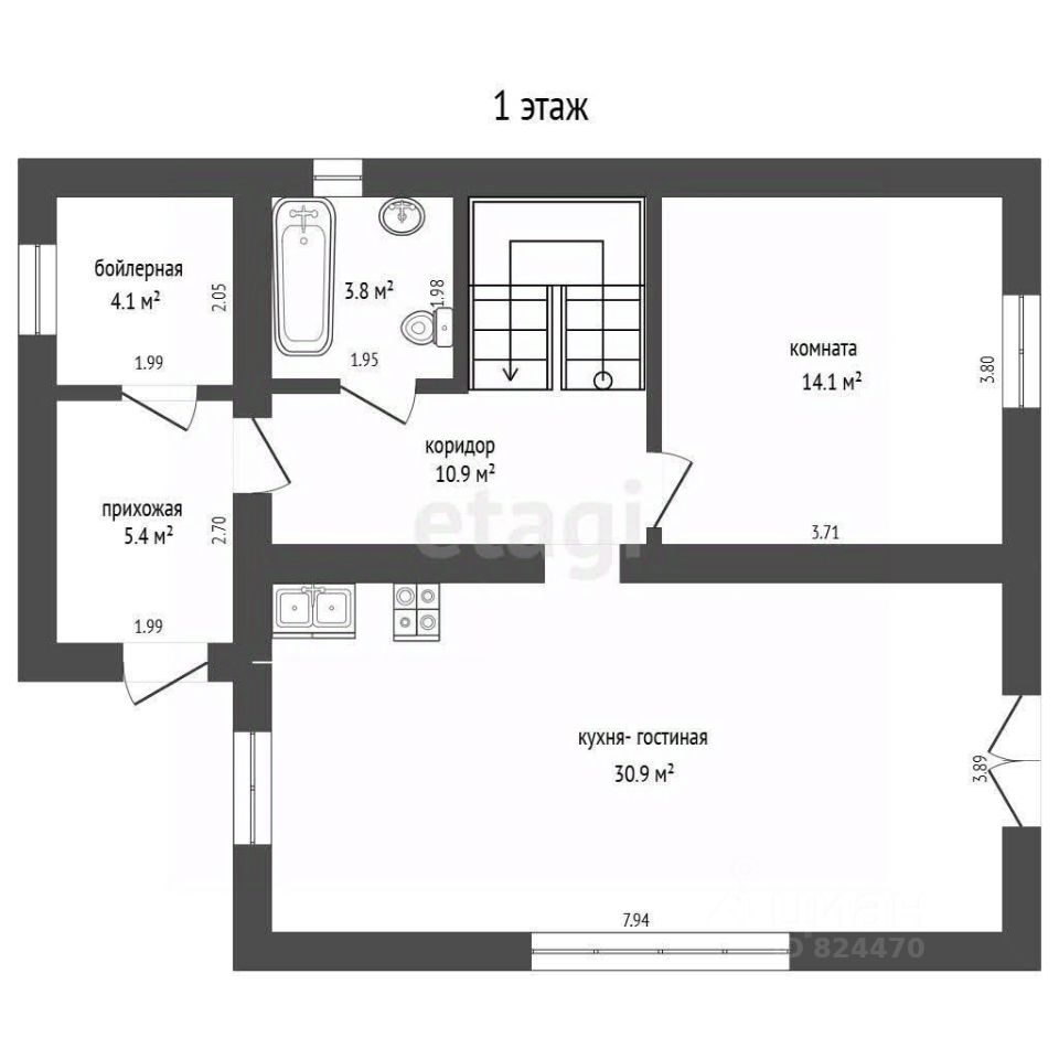 1-й этаж: прихожая, бойлерная, санузел, кухня-гостиная, изолированная комната.