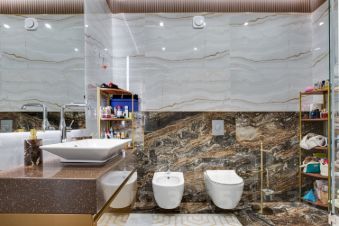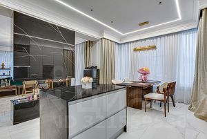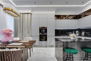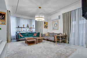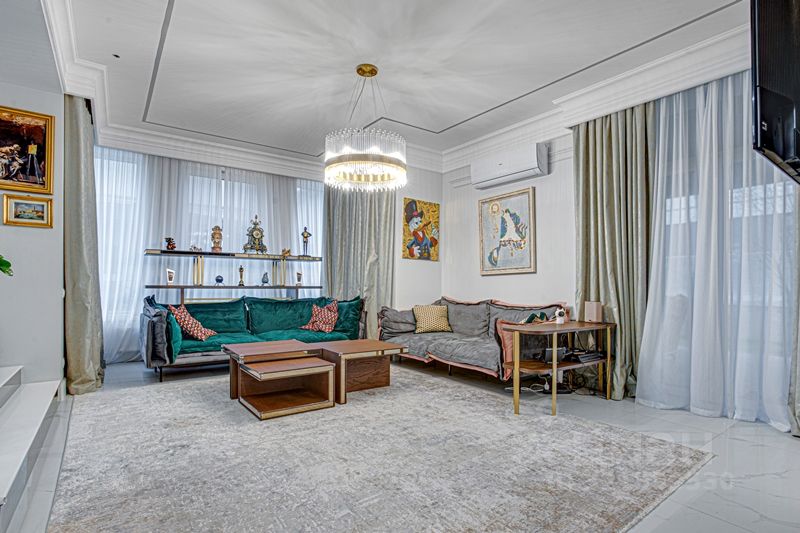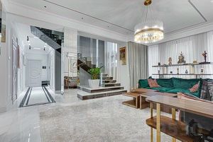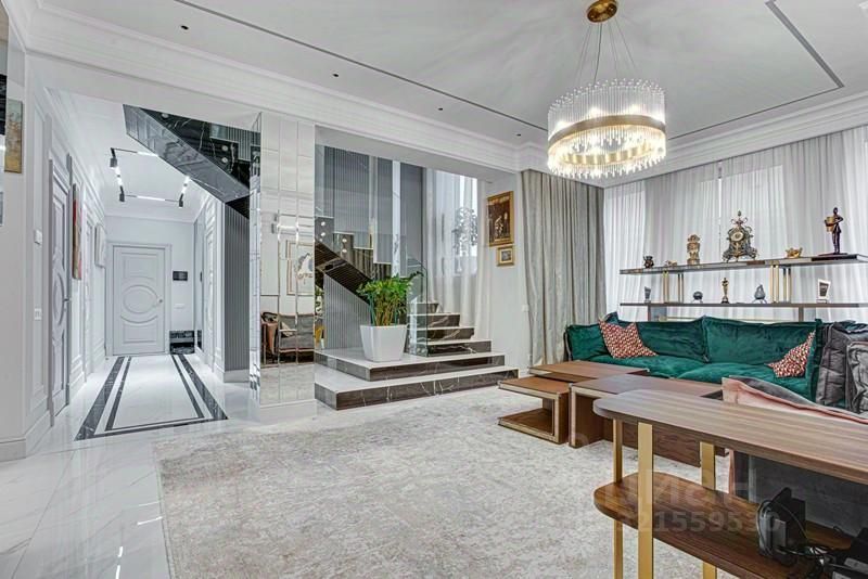 Интерьер дома выполнен в современном стиле с элементами классики, в интерьере использованы преимущественно светлые оттенки с яркими цветовыми акцентами. Продается с полной меблировкой. Дом управляется системой "Умный дом", установлена система очистки и смягчения воды.