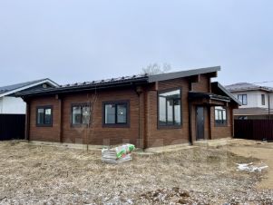 Коттедж 111,3м2 с отделкой из бруса 220мм, в КП 5 соток, на участке 5,7 соток, огорожен: калитка и автоматические ворота. Фундамент - монолитная плита 300мм + отмостка вокруг дома.