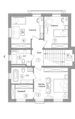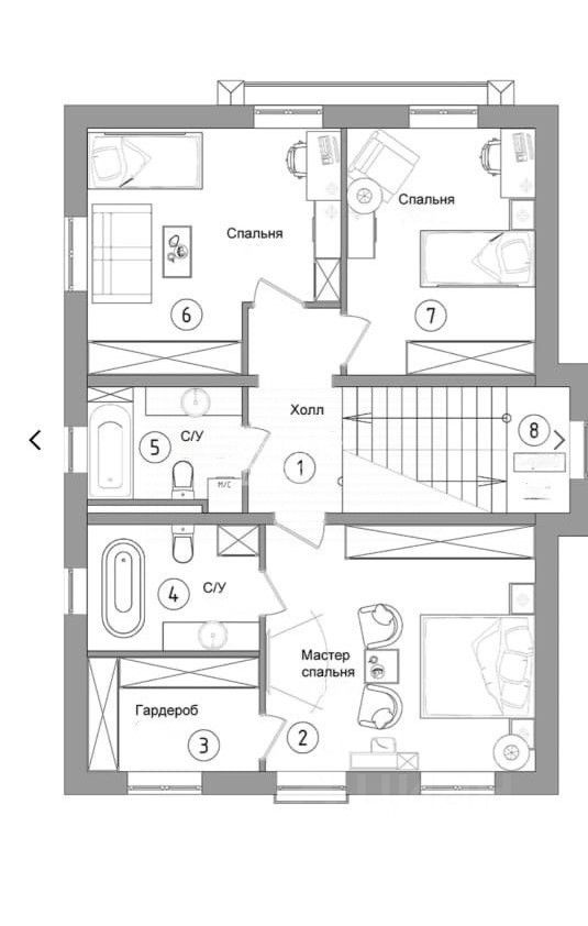4 спальни, одна — на первом этаже (можно использовать как кабинет или гостевую)
