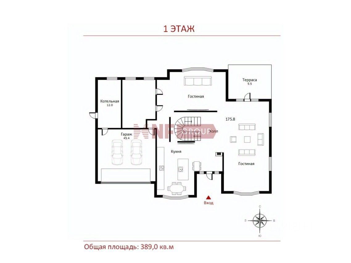 1 этаж: прихожая, гостиная с дровяным камином, вторым светом и выходом на террасу, кухня, гардеробная, котельная, гараж на 2 машины, бытовое помещение.