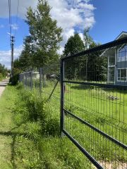 Забор из 3Д панелей по фасаду. Сделаны двое ворот + калитка. Забор на задней части не устанавливали — выход в лес и к реке, чужие пройти не могут, а участок кажется безграничным.