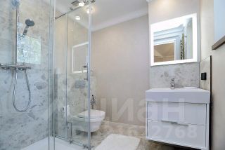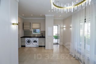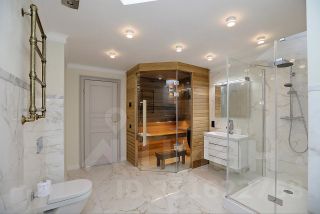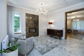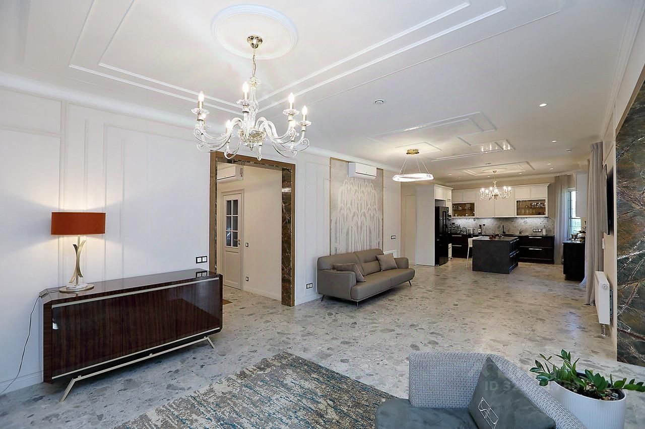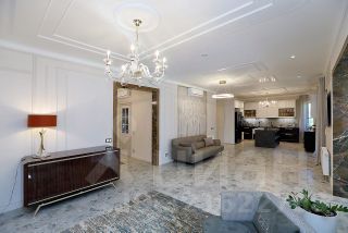 Современный красивый внутренний интерьер. В отделке использованы качественные и селекционные материалы. Поверхность пола выполнена в стиле старинного камня Terrazzo alla veneziana, стены и потолок оформлены венецианской штукатуркой и слэбами мрамора Бидасар Грин.
