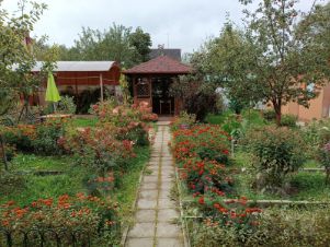 На участке кирпичный гараж, гостевая крытая парковка, вымощенная плиткой, колодец, сарай из блоков на фундаменте, беседка, летний крытый бассейн, площадка для отдыха, дорожки, мангал.