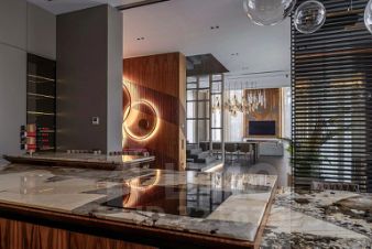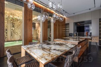 Для столешницы кухни, отделки бассейна и санузла выбран благородный кварцит — элитный натуральный камень.