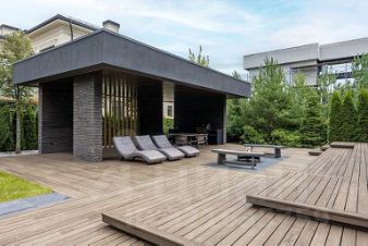 - Два навеса: один для уличной кухни, второй для парковки автомобилей.