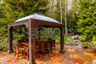 Выполнен дренаж, смонтировано уличное освещение, установлена система автоматического полива, дорожки выполнены натуральным камнем.