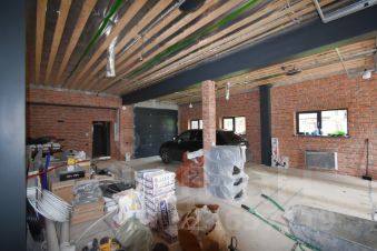 На территории участка построен гараж - отдельностоящее здание общей площадью 114 кв. м. Фундамент гаража монолитная армированная плита с ребрами жесткости толщиной до 600 мм. Стены гаража монолитный железобетонный каркас с заполнением пенобетонными блоками BONOLIT D400, с наружным 100 мм минеральным утеплителем и черновой штукатуркой. Крыша гаража покрыта цементно-песчаной черепицей по технологии brass с 300 мм утеплителем. В гараже установлено трое ворот АЛЮТЕХ серии Prestige с электроприводами. Внутри гаража выполнена разводка всех инженерных систем и чистовая отделка высококачественными отделочными материалами.