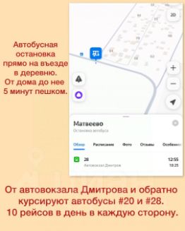 Хорошая инфраструктура: в 5 минутах пешком автобусная остановка. До автовокзала Дмитрова курсируют автобусы и маршрутки 20, и 28. Общее количество рейсов в день - по 10 в обе стороны. В непосредственной близости поселок Горшково с полной поселковой инфраструктурой - школа, детские сады, медпункт, аптеки, магазины, спортплощадка и тд.