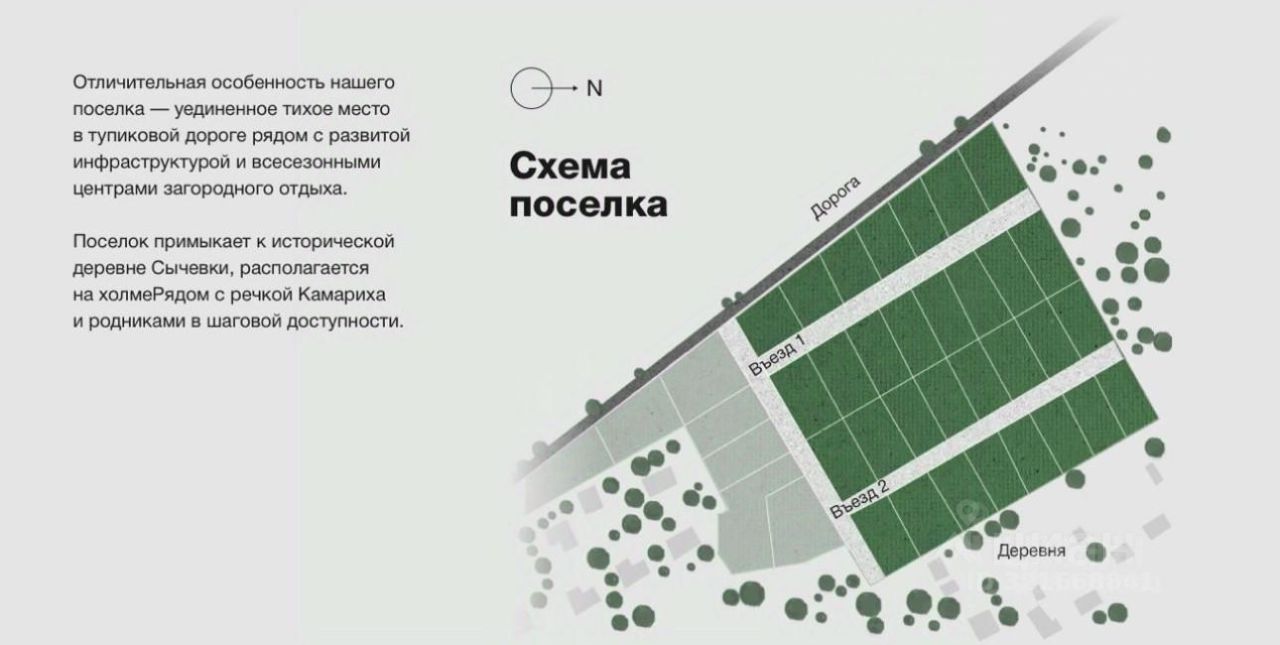 Участок имеет 2 улицы въезда/выезда на территорию поселка, каждый въезд - отдельная улица, улица ближе к деревне активно застраивается - на данный момент уже построено 6 домов, 3 из них зарегистрированы и отображаются на яндекс картах.