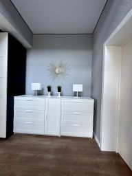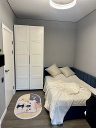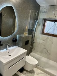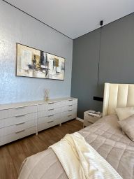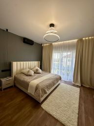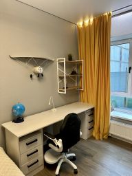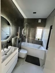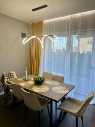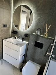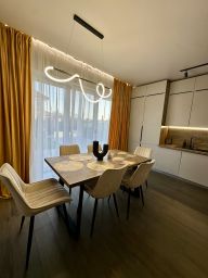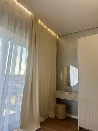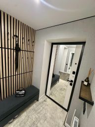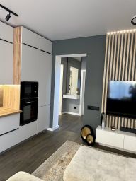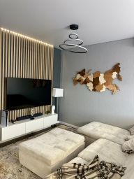 Ремонт: Выполнен по дизайнерскому проекту с использованием современных материалов: итальянский керамогранит, массив дерева, стекло и металл. Авторский световой сценарий и продуманная эргономика каждого метра.