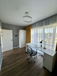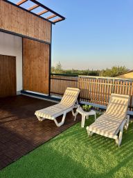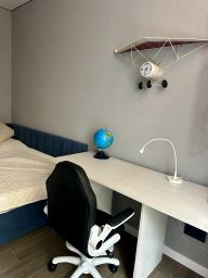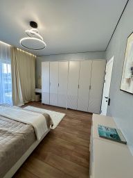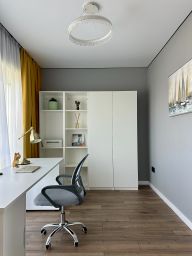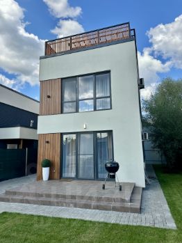 Планировка: Просторная кухня-гостиная с выходом на террасу, панорамная терраса на крыше дома, 3 изолированные спальни, кабинет, 2 санузла, подсобное помещение для хранения, гардеробная система
