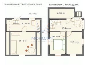 Первый этаж: терраса (13,3 кв м), 2 комнаты ( 12,4 +12,4 кв м);