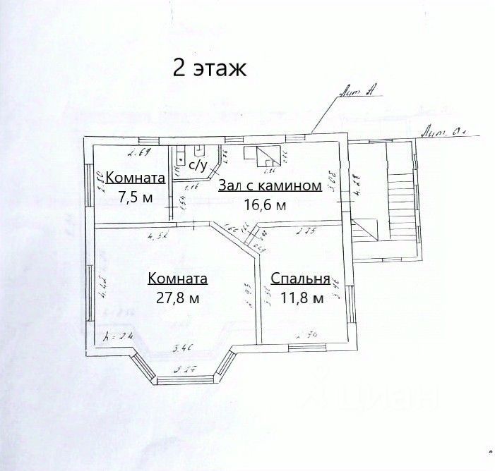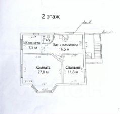 2 этаж: 3 комнаты (27,8 /11,8 / 7,5) кв.м., зал с камином 16,6 кв.м., совмещенный с/у.