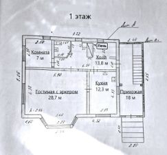 1 этаж: большая прихожая 18 кв.м, кухня 12,3 кв. м, гостиная с эркером 28,7 кв.м., спальня 7 кв.м., холл с печью, гардеробная, совмещенный с/у.