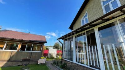 К дому прилегает терраса с панорамным остеклением, раздвижные створки в пол. Терраса уютно укомплектована мебелью.