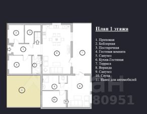 Планировка дома включает: на 1 этаже расположены: бойлерная; постирочная; комната свободного назначения; санузел; кухня-гостиная; открытая терраса; веранда с сауной и отдельным санузлом. На 2 этаже коттеджа имеется 2 детских комнаты; спальня с кабинетом; санузел. В доме теплый пол; разводка интернета; спутниковое телевидение. Так же при входе в дом есть навес для автомобилей. Площадь дома с учета веранды, сауны и санузла составит 180 метров. Все коммуникации в поселке центральные.