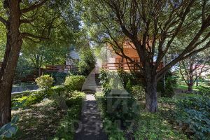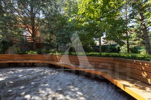 Участок зеленый, лесной, со взрослыми деревьями и ландшафтным дизайном.
