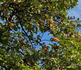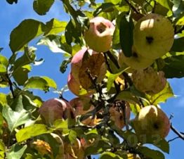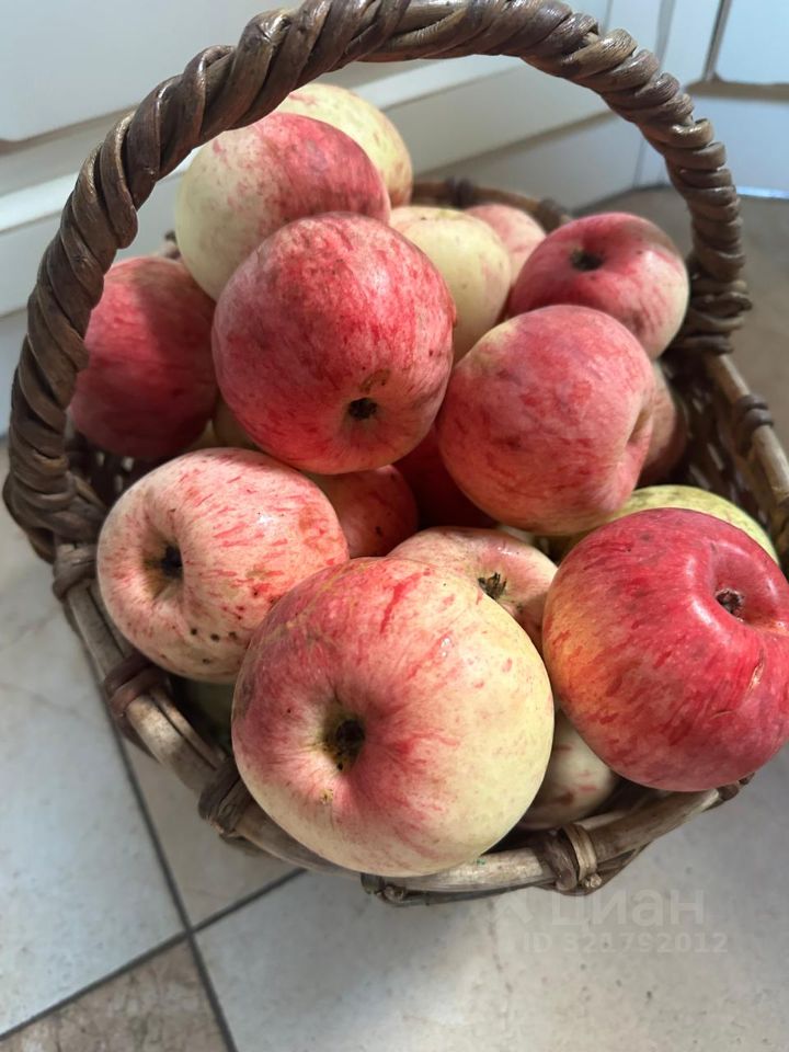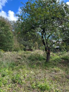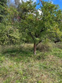 Участок ровный, с четырьмя плодоносящими яблонями и прямым выходом в лес.
