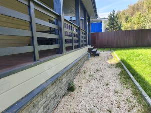1 этаж: Просторная кухня-столовая с выходом на большую веранду (30 кв.м). На веранде установлены мягкие окна. Спальня, санузел, гостиная.
