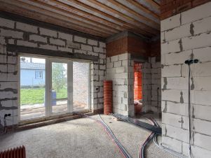 Планировка: большой холл, гостевой с/у, большой с/у, 3 просторные спальни, гардеробная, большая светлая кухня/гостиная с выходом на открытую веранду. Высота потолка в завершенном виде 3.10.