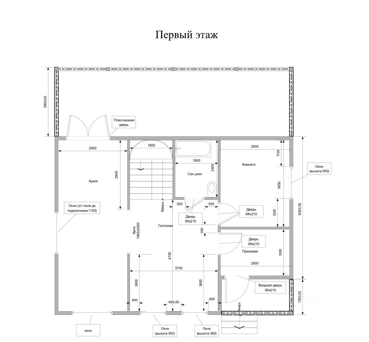 1 этаж: Просторная кухня-столовая с выходом на большую веранду (30 кв.м). На веранде установлены мягкие окна. Спальня, санузел, гостиная.