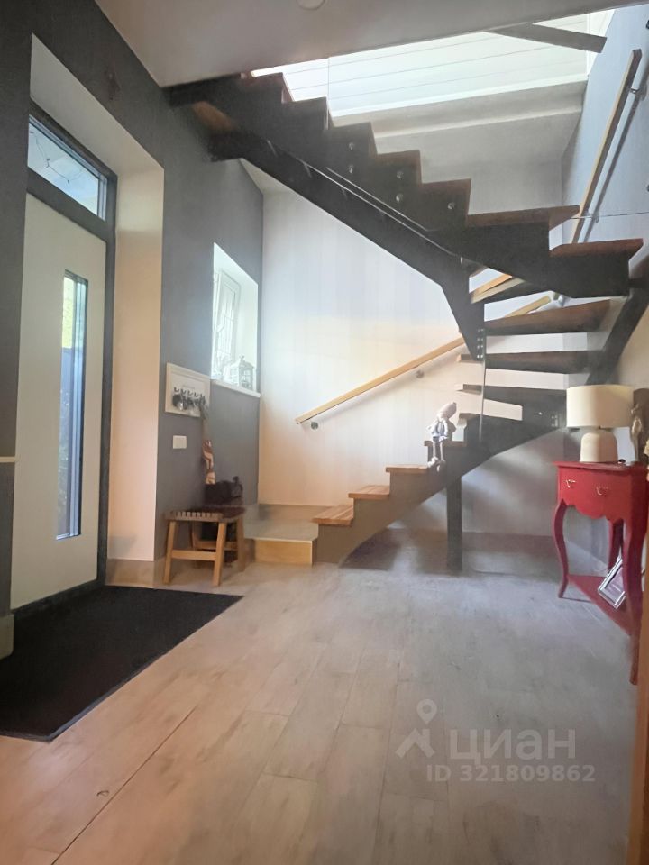 Лестница на металлическом каркасе заводского исполнения, ступени из лиственницы. В доме два входа (входная группа и дверь на открытую террасу из кухни). Остается рабочая кухонная зона с ПММ Bosch (Германия) и другой встраиваемой техникой, холодильник Maytag (США), остальная мебель, верхний свет по желанию.