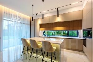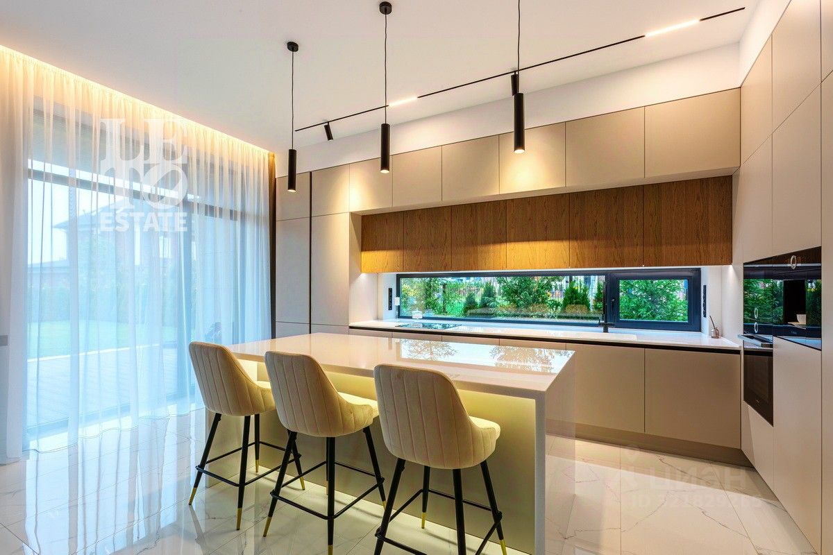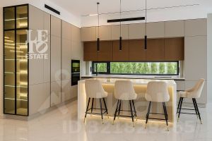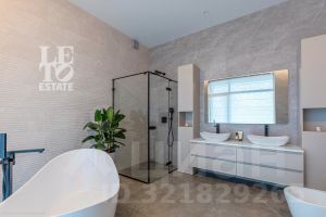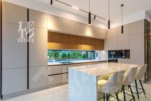 Дом построен из блоков, монолитные перекрытия, крыша - мягкая кровля. Спроектирован с использованием основных принципов премиальной недвижимости: современный стиль, панорамные окна, высокие потолки 3,2 м. В доме есть вся необходимая встроенная техника и мебель. Продуманная планировка: пять спален, одна из которых расположена на первом этаже. На кухне есть вся необходимая встроенная техника. В каждой спальне установлена система кондиционирования.