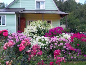*Озеленение: много плодовых/декоративных деревьев, кустарников селекционного происхождения, реально дающих урожай, грядки, клумбы, газон.