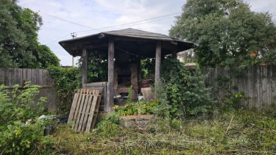 Гараж и хозяйственные постройки возведены из блоков, обложены красным кирпичом.