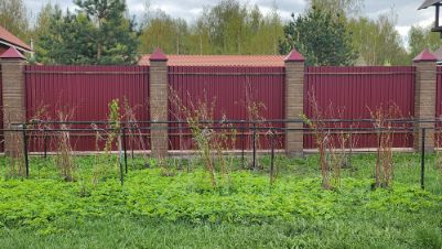 По периметру участок огражден забором: с боковых сторон из профлиста, с передней и задней части - фундамент, кирпичные столбы и профлист.