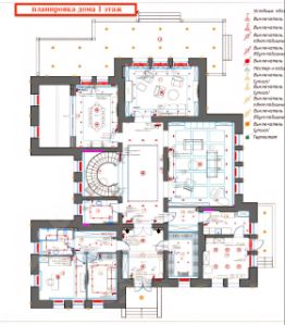 1 этаж - прихожая, гардеробная, просторный холл, кухня-столовая с выходом на террасу, гостиная, каминная, спальная комната, два санузла, вспомогательные помещения.
