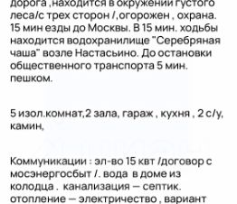 Коммуникации : эл-во 15 квт /договор с мосэнергосбыт /. вода в доме из колодца. канализация - септик. отопление — электричество, вариант инверторные кондиционеры /дешевле эл-ва в 3-4 раза/. Газ высокого давления проходит вдоль киевского шоссе /300 м / идут переговоры согласно газификации новой Москвы . ква. с пропиской. участок 630 м2