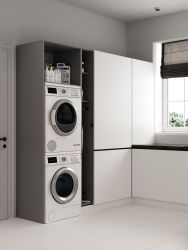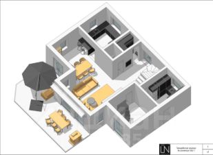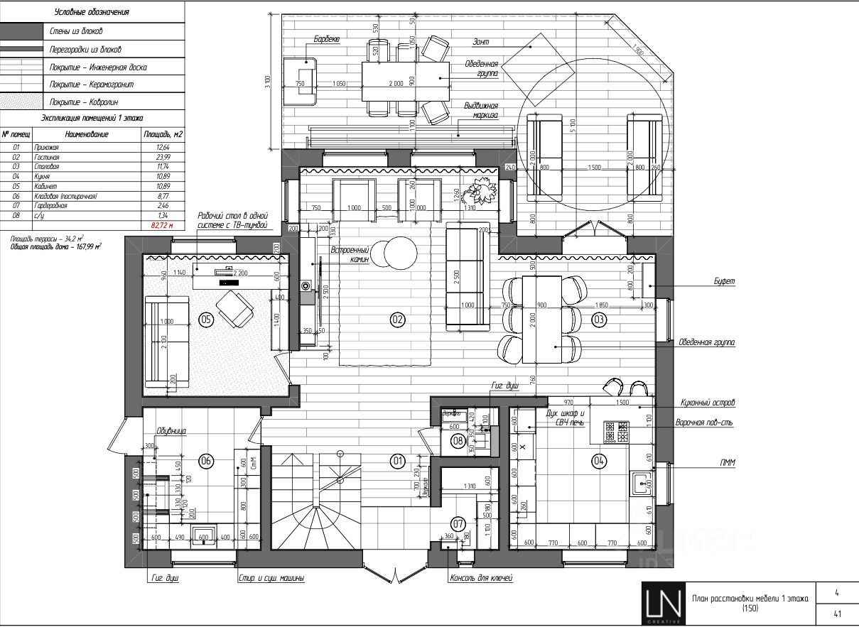 - Первый этаж: просторная гостиная с камином и выходом на террасу, кухня, гардероб и постирочная с отдельным выходом. Панорамные окна в пол наполняют дом светом и создают ощущение единства с природой.