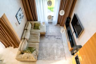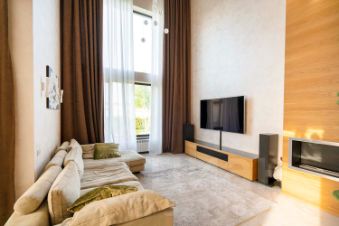 В доме много солнечного света, потому что он правильно ориентирован по сторонам света, спланирован с высокими потолками и панорамными окнами. В течение дня солнце заглядывает в каждую комнату.