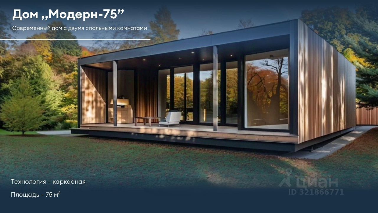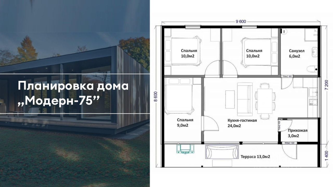 * Площадь дома: 75 м² — 3 комнаты + кухня-гостиная - просторное пространство для семьи;