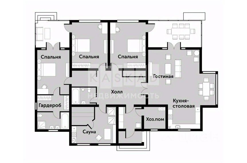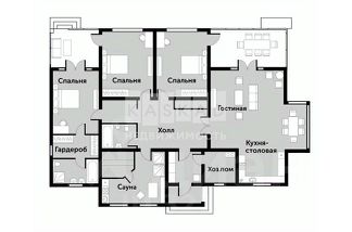 - Планировка: кухня-столовая совмещенная с гостиной, 3 спальни, гардеробная, сауна и 2 санузла.