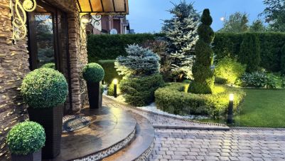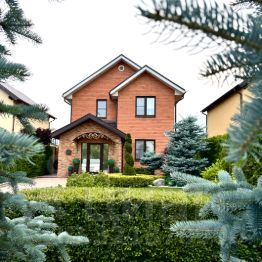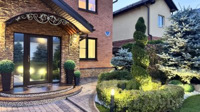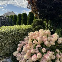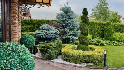 Озеленение участка: туи, голубые ели, рододендрон, гортензии, клёны на штамбе, кустарники и др. С весны по осень всё цветёт, отцветает одно, зацветает другое, зимой, благодаря большому количеству хвойников, участок остается зеленым. Круглый год красиво и эстетично!