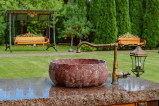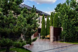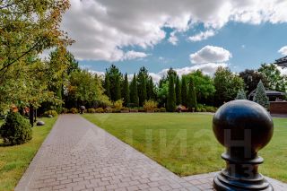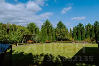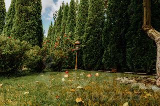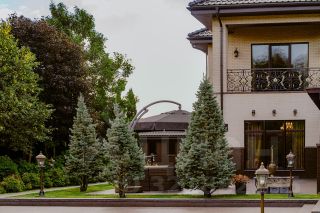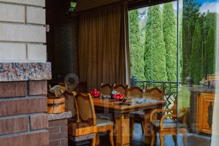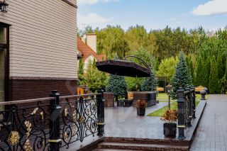 Летняя кухня с мангалом примыкает к правому крылу виллы. Участок ровный, газон, высажены плодовые деревья и кустарники, по периметру участка растут туи.