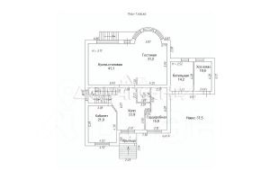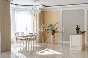 Первый этаж великолепие света и пространства. Большие двери из стекла наполняют прихожую и просторный холл, переходящий в зону гостиной, дневным солнечным светом. Кухня-столовая с изящным эркером имеет выход в сад к летней веранде. Кухонный гарнитур из массива дерева и рабочие поверхности из натурального кварца создадут атмосферу изящества и элегантности. Также на первом этаже кабинет, который можно использовать как дополнительную спальню, с\у. Напротив очень вместительной гардеробной комнаты расположено большое зеркало, которое дополнительно увеличивает пространство, а изящные люстры и фигурные подсветки потолка отражаются в глянце пола из светлого керамогранита. Кладовое помещение и котельная имеют вход со стороны навеса для автомобилей.