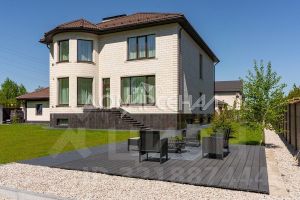Участок правильной формы, огорожен в едином стиле поселка, въездная группа вымощена брусчаткой, забетонирована и вымощена площадка зоны барбекю. Имеется навес на 2 машиноместа. Участок выровнен, сделан дренаж, уложен газон. Высажены яблони и груши, также в ландшафте имеются декоративные деревья и кустарники.